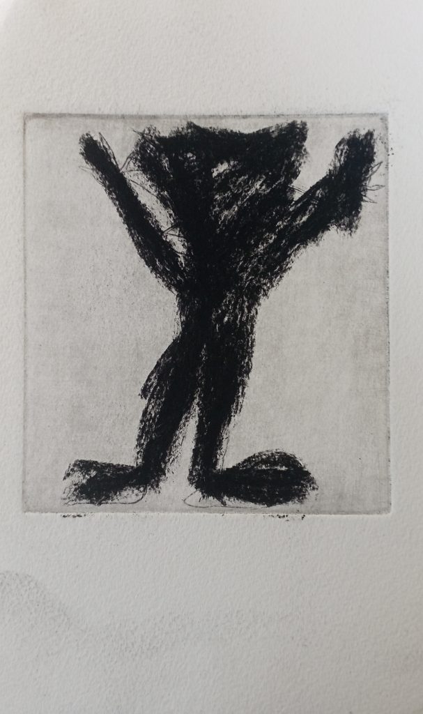 Zur Zeichnung: Übermalung 2. Während meiner grippalen Schwächezeit hatte ich mangels Bewegungskraft gedacht, es wäre sinnvoll, in dieser Zeit wieder etwas Zettelzeug auszusortieren. Nicht unbedingt eine gute Idee, war es doch teilweise auch sehr überfordernd. Die obigen, arnulf-rainer-likeschen Zeichnungen entstanden, nachdem ich Radierungen von mir von 1995 o.s. wiederfand, deren Motive mir missfielen und ich sie kurzerhand mit Kohle übermalte.